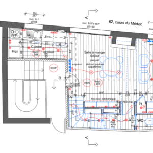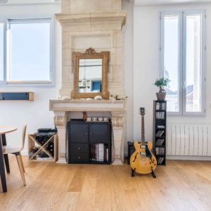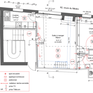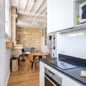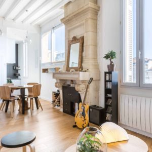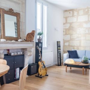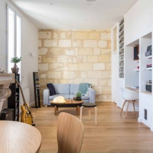 Le 1errendez-vous a eu lieu avant l’achat pour évaluer les potentiels de l’appartement. Cet appartement, dans le quartier des Chartrons, avait au 1erniveau, une chambre, un salon et une cuisine. Le 2eniveau était réservé pour une autre chambre. Un escalier très étroit et raide menait à la mezzanine qui était ouverte. Le plafond avec poutres était de couleur sombre. Une cheminée en pierre, trop imposante pour l’espace, était également mal placée dans un angle. La salle de bains en mauvais état était très vieillissante. Et enfin le WC était dans la salle de bains.