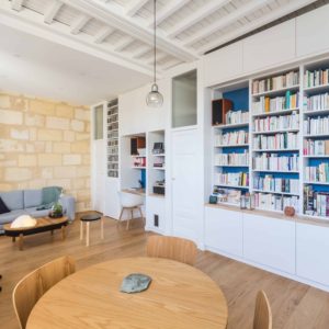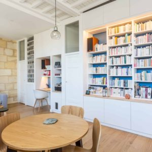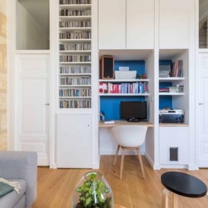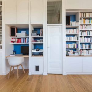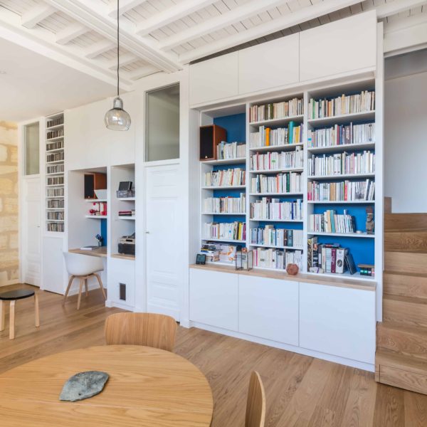 2 – Deux grandes bibliothèques sur mesure permettent un habillage du mur blanc tout en offrant l’espace de rangement et la touche personnelle voulus par le propriétaire. Ainsi la porte pour accéder à la salle d’eau et celle pour accéder au WC font partis du rythme du mur de rangement.