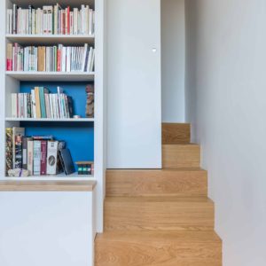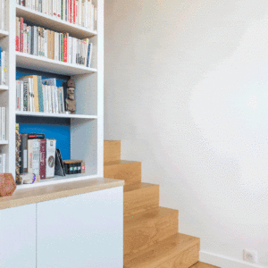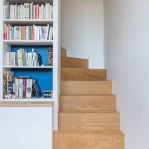 3 – Un véritable escalier plus large et plus ergonomique a été créé derrière la bibliothèque, en même temps que celle-ci, ce qui a permis également d’intégrer une porte coulissante isolant ainsi l’étage.