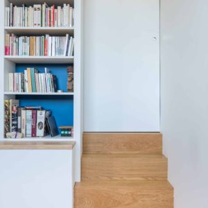 - Une porte coulissante à galandage a été créée dans la bibliothèque au bout de quelques marches, afin d’isoler l’espace chambre de la mezzanine de l’espace à vivre.