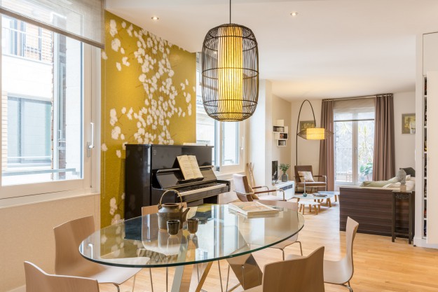 Rénovation complète d’un appartement très lumineux mais trop cloisonné qui était resté figé dans les années 80. L’accès à la cuisine se faisait depuis l’entrée. Elle a été condamnée, maintenant elle se fait depuis le séjour. Ainsi ont pu être créé de nombreux rangements dans l’entrée. Elle était de toute façon trop grande au gout…