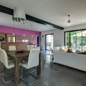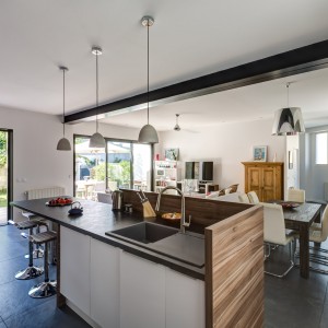 Créer une grande pièce à vivre familiale, créer une vraie circulation intérieur-extérieur, profiter de la vue sur le jardin et de l’exposition sud. Relier le garage à la maison, conserver une salle TV