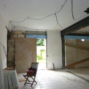 Problématiques : les pièces sont distribuées par un couloir central, la cuisine est fermée, l’accès au jardin est limité, il n’existe pas de communication entre le garage et la maison, il y a une salle d’eau, ainsi qu’une salle TV.