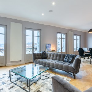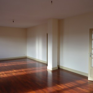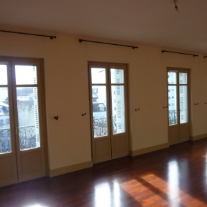 L’appartement disposait d’une cuisine séparée un peu sombre et avec une fenêtre sans vue intéréssante, d’un beau séjour avec 4 portes fenêtres bien orientées, de 2 chambres et d’une salle de bains.